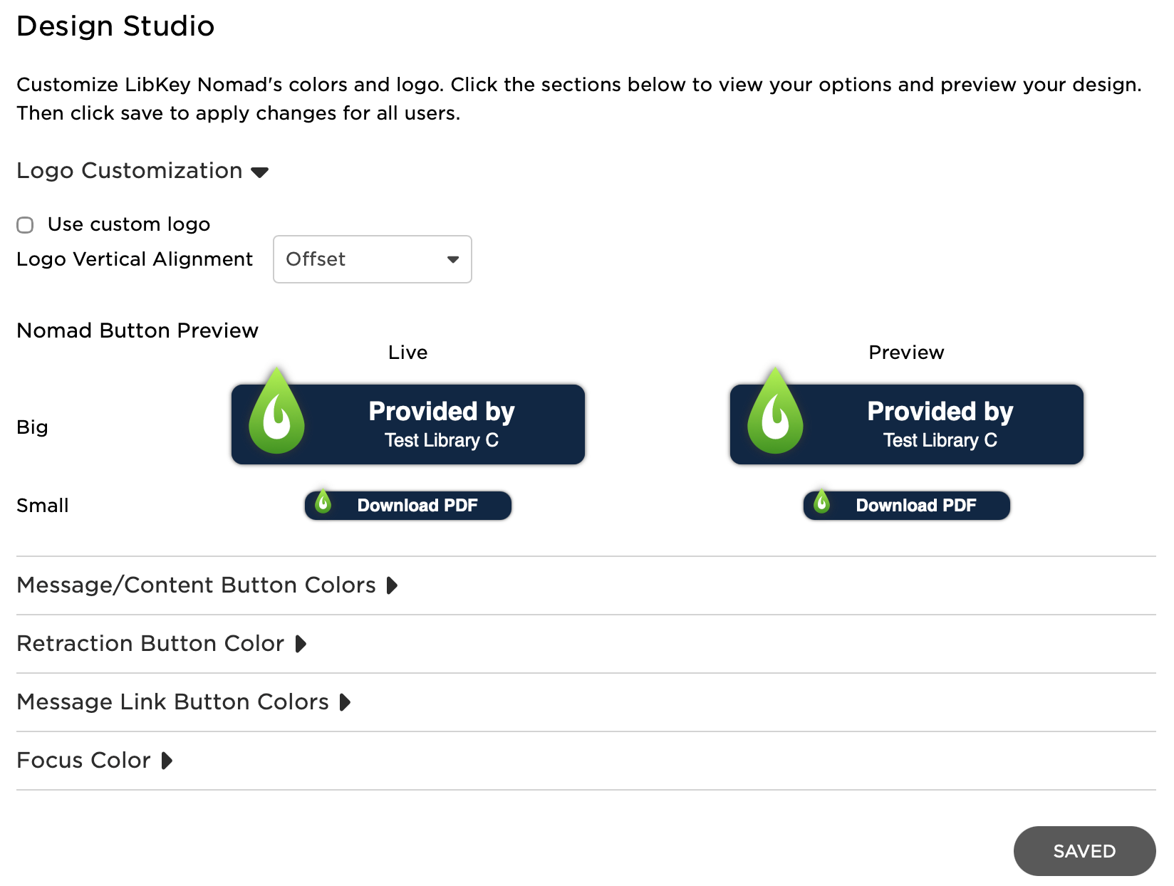 The design studio module provides the opportunity for a library admin to customize the look of the messages and buttons that Nomad uses.  There are five sections that are independent of one another and none, some or all of these may be used to achieve the result you would like. You can reveal these sections (and thus enable or disable them) by checking the triangular arrow shown next to each section.